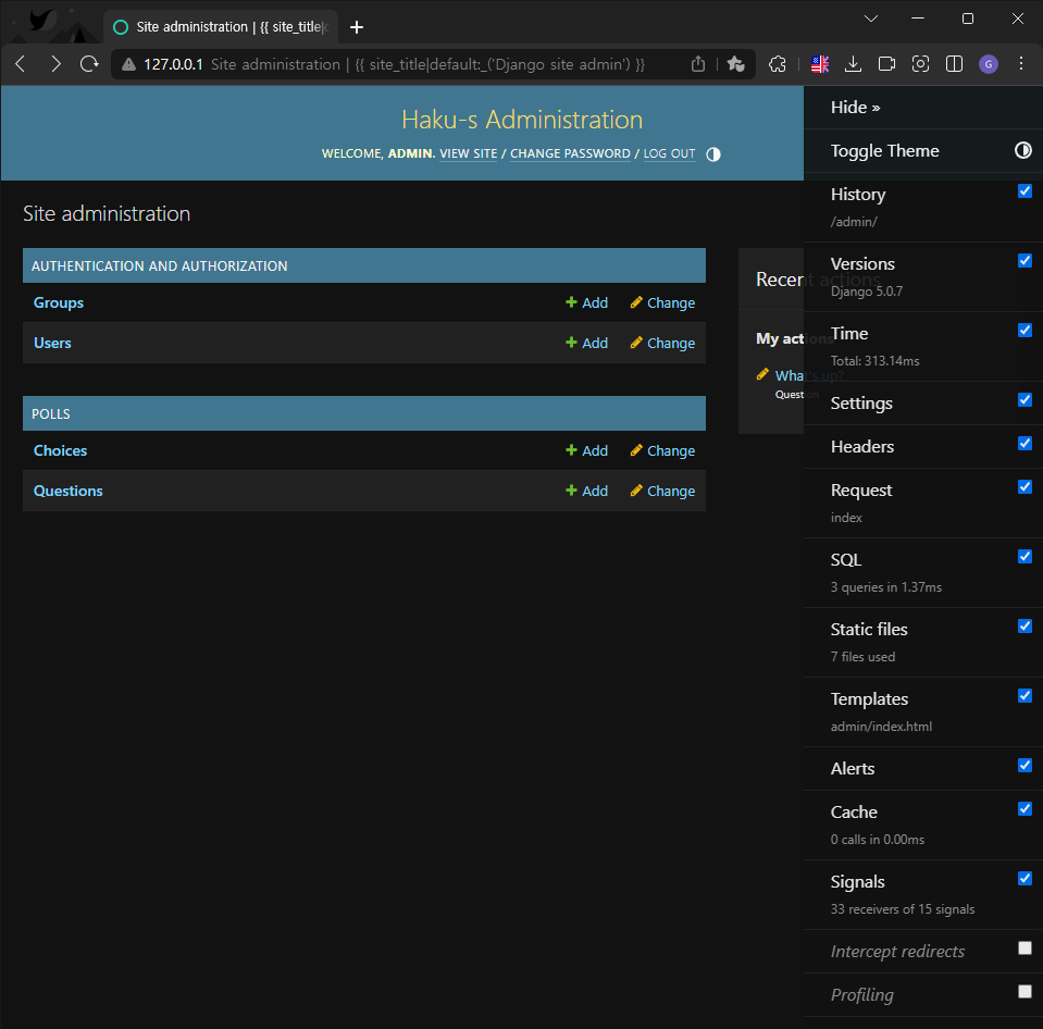 서버를 실행시키고 http://127.0.0.1:8000/admin/ 페이지로 이동하면 다음의 이미지와 같이 우측에 toolbar가 보인다.