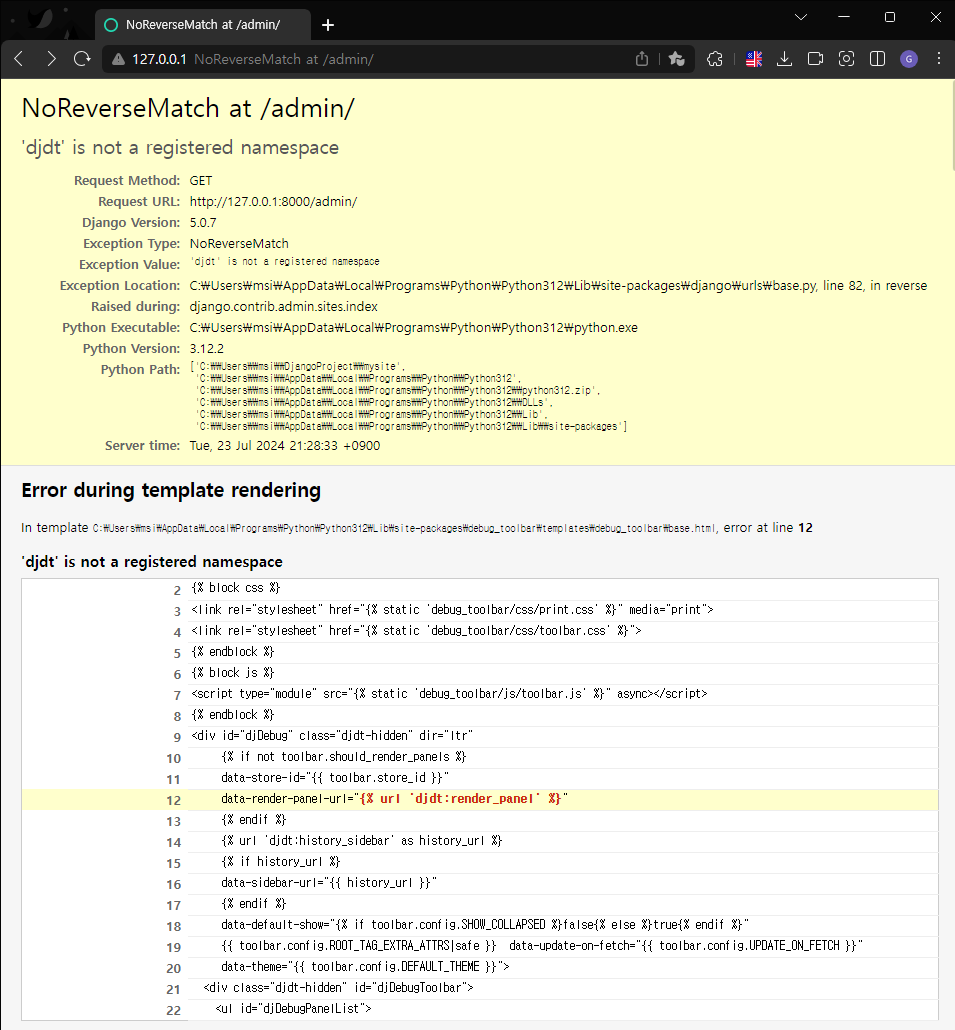 툴바를 다시 없애고 싶다고 urls.py의 코드만 제거하면 http://127.0.0.1:8000/admin/ 페이지가 올바르게 나오지 않는다.