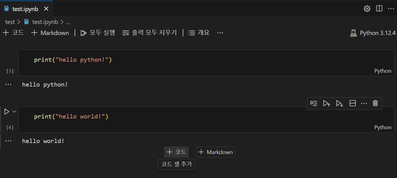test.ipynb 파일을 생성 후 첫 번째 셀에서는 print("hello python!")을 추가했다.